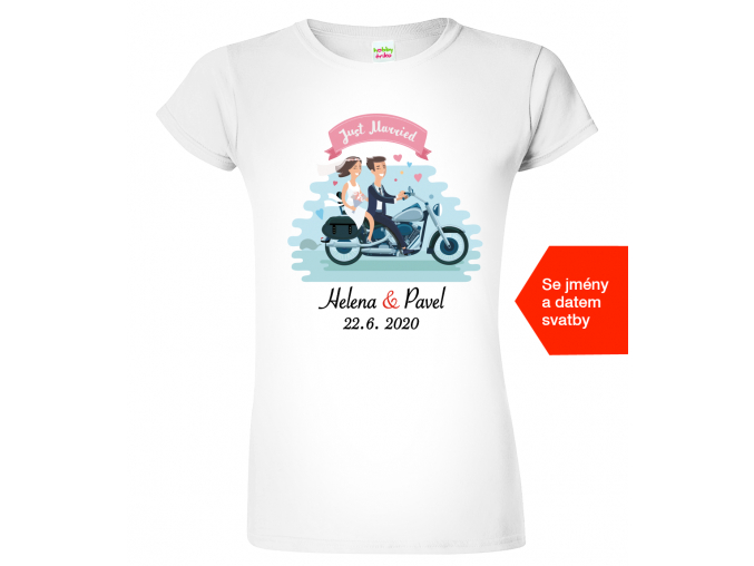 Svatební tričko pro nevěstu vášnivou motorkářku. Nádherné svatební tričko s motorkou a novomanželi je vyrobeno ze 100% bavlny. Toto tričko s vlastním potiskem - se jmény novomanželů je originální a osobní svatební dar, který rozhodně není všední. Jména novomanželů napište do poznámky k objednávce a do několika dní máte toto úžasné svatební tričko doma. Hledáte dárek na motorkářskou rozlučku se svobodou? Toto svatební tričko je ta pravá volba. Naše svatební trička je vytištěna nejmodernější technologií. Potisk se neloupe, nepraská a je příjemný na dotek. Je zapitý do vláken textilu. Tričko pro nevěstu nabízíme v tradiční bílé barvě až do velikosti 3XL. S potiskem svatebních triček máme dlouholeté zkušenosti. Tomu odpovídají i kladné recenze našich zákazníků na Heureka.cz.
