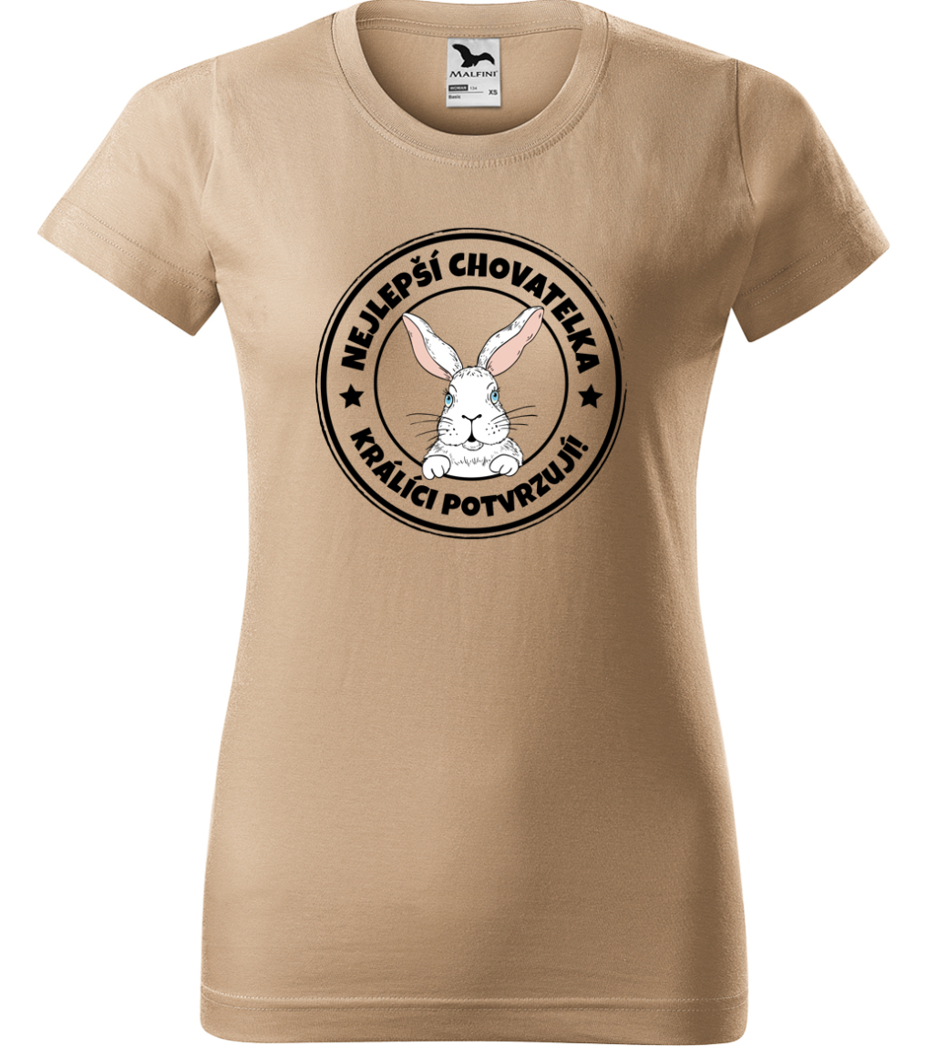 Tričko s králíkem Tričko s králíkem pro ty nejlepší chovatelky. Chovat králíky je prostě radost a ještě větší radost bude nosit tuto informaci hrdě na stylovém 100% bavlněném tričku. Dámské tričko s králíkem má vyšší gramáž textilu a moderní vypasovaný střih. Jen u nás si můžete vybrat z mnoha barevných variant triček i velikostí. Sami si tak sestavíte kousek oblečení přesně dle vašeho gusta. Tričko s králíkem a textem "Nejlepší chovatelka - králíci potvrzují!" má prvotřídní potisk - nepoužíváme nažehlovací samolepky, ale potisk, který je přímo na textilu. Za kvalitu našich produktů hovoří spokojené recenze našich zákazníků, kteří už u nás nakoupili. Tak, kdo je tady ten nejlepší chovatel?