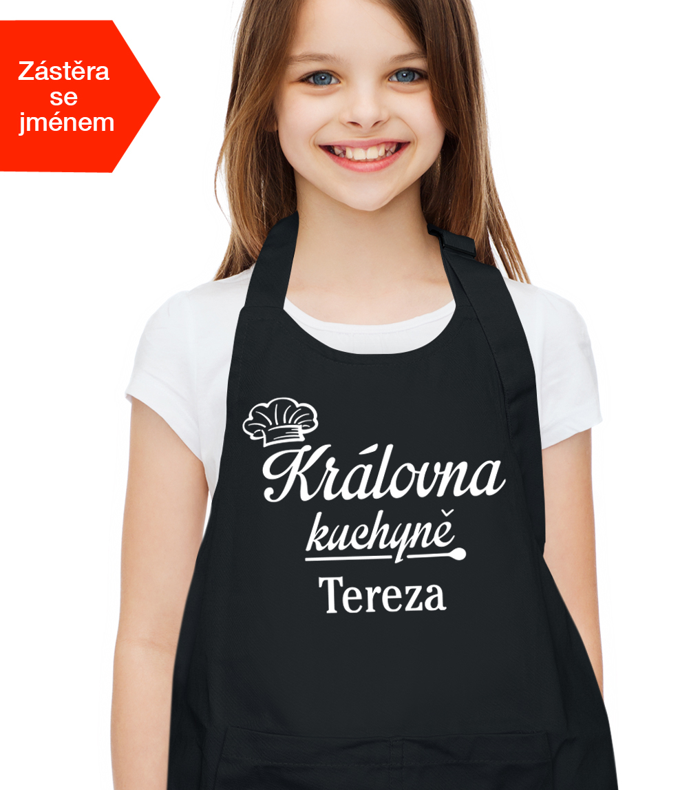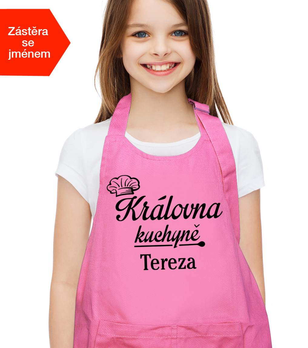 Dětská zástěra na vaření se jménem a s motivem "Královna kuchyně" potěší všechny dívky, které doma pomáhají v kuchyni nebo třeba už samy vaří. Hledáte dárek pro dceru, která je vášnivou kuchařkou? Pro dívku, která se v kuchyni cítí jako královna? Tato originální zástěra s nápisem "Královna kuchyně" a jménem, obdarovanou určitě potěší. Jméno malé kuchařky jednoduše napíšete do poznámky a my ho vytiskneme na zástěru. Dětská zástěra na vaření je oblíbený dárek k narozeninám nebo k Vánocům. Zástěra se jménem je vyrobená ze 100% bavlny a opatřená laclem a řemínkem s kovovou sponou pro nastavení délky. Vepředu na zástěře je dvojitá kapsa. Zástěra na vaření je vhodná pro děti od 3-15 let a můžete si vybrat z několika barevných variant.