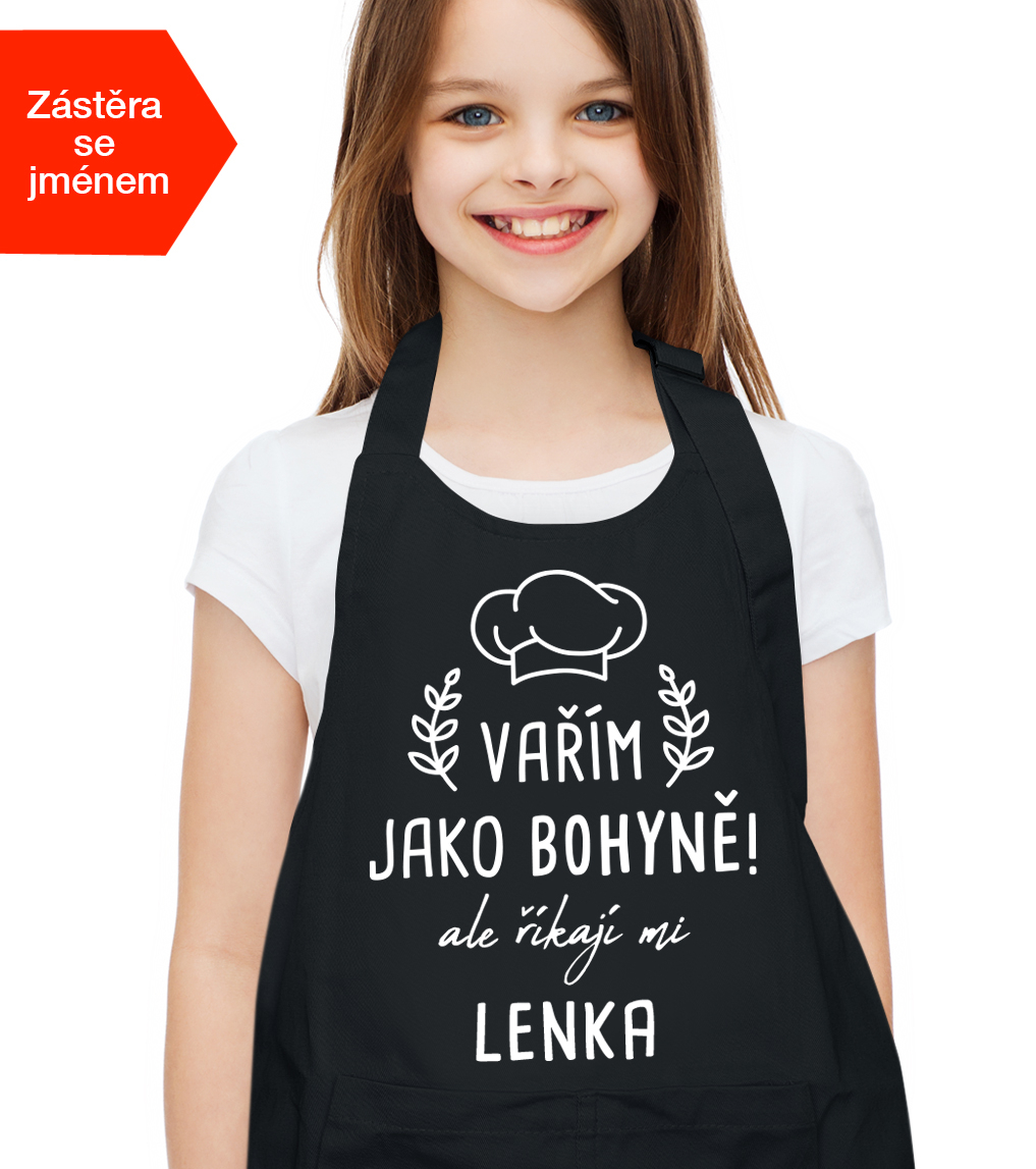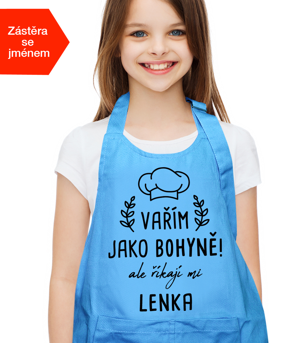 Dětská zástěra na vaření s potiskem "Vařím, jako bohyně, ale říkají mi..(jméno dívky)" je to nejlepší, co si na sebe při vaření může vaše dcera nebo vnučka obléct. V našich zástěrách se totiž skvěle vaří! Skvělý tip na dárek pro dceru, která už sama vaří nebo pomáhá v kuchyni. Dětská zástěra se jménem je vyrobená ze 100% bavlny vyšší gramáže 280 g/m². Zástěra je opatřená laclem a dvojitou přední kapsou. Zástěra na vaření je vhodná pro děti od 3-15 let a můžete si vybrat z několika barevných variant. Na zástěru vytiskneme jméno, které napíšete do poznámky. Pokud vaše dcera vaří jako bohyně, pořiďte jí naší zástěru na vaření s jejím vlastním jménem. Všechny naše produkty mají špičkovou kvalitu. Na textil používáme nemodernější tiskovou technologii, která zaručuje vysokou kvalitu potisků a krásný profesionální vzhled.