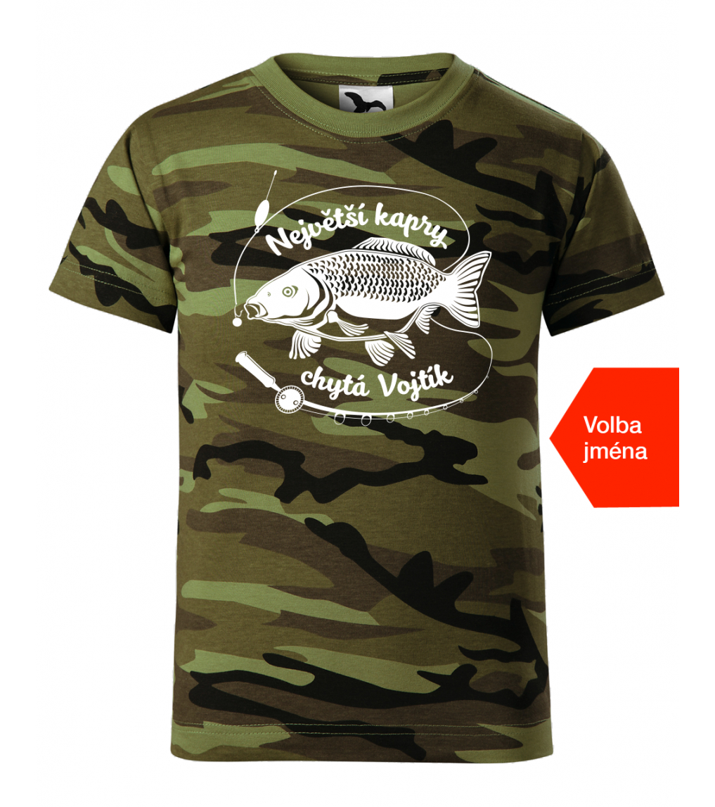 Máte doma rybáře, který chytá ty největší kapry? Kupte mu parádní rybářské maskáčové tričko s kaprem a jeho jménem! Toto oblíbené rybářské tričko můžete mít doma již zítra. Dětské rybářské tričko pro kluky i holčičky od 4 -12 let je vyrobené ze 100% bavlny.