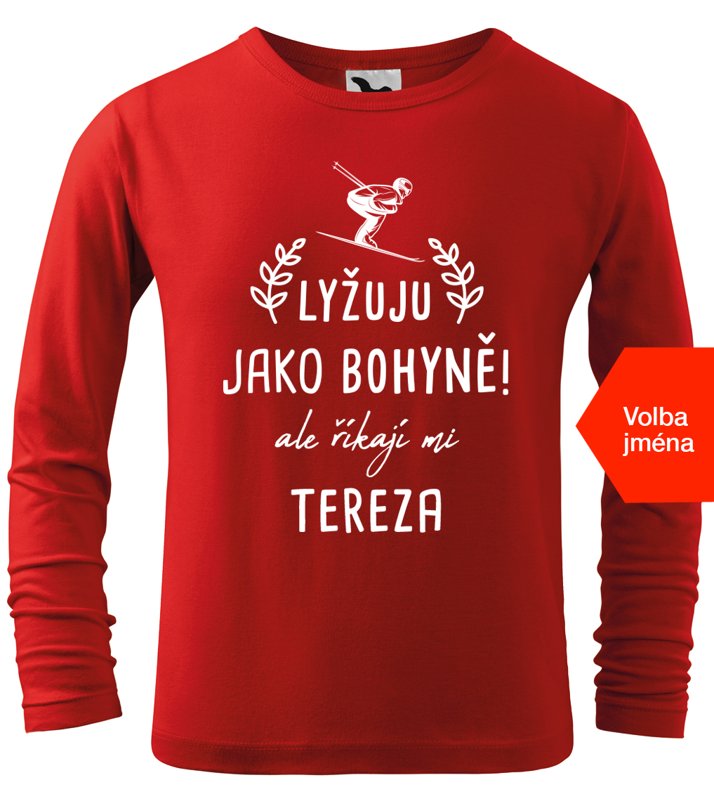 Dětské tričko pro lyžařku se jménem - Lyžuju jako bohyně, ale říkají mi.. (dlouhý rukáv)