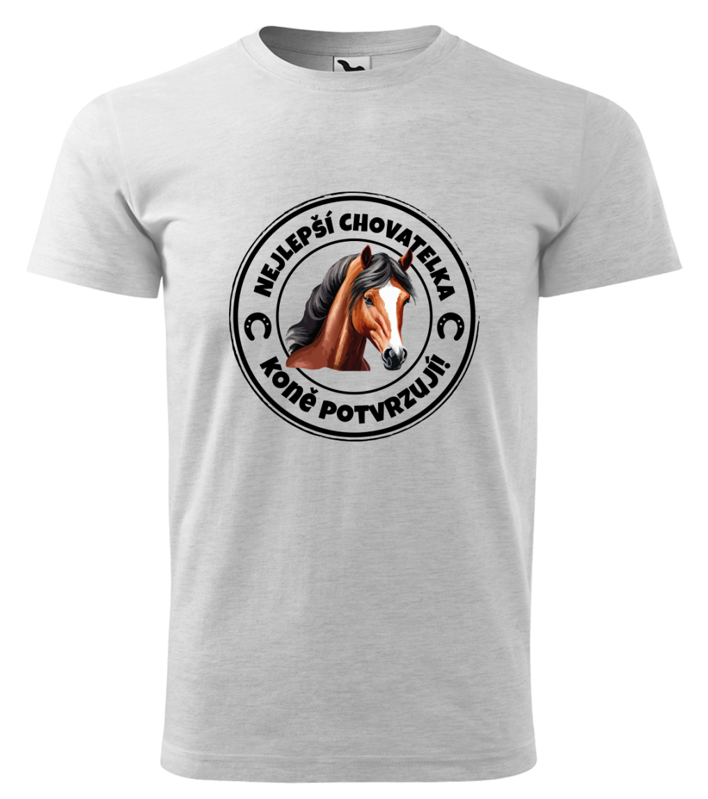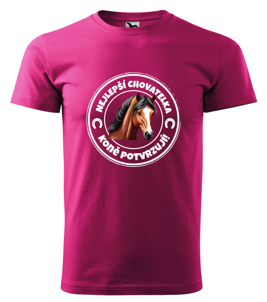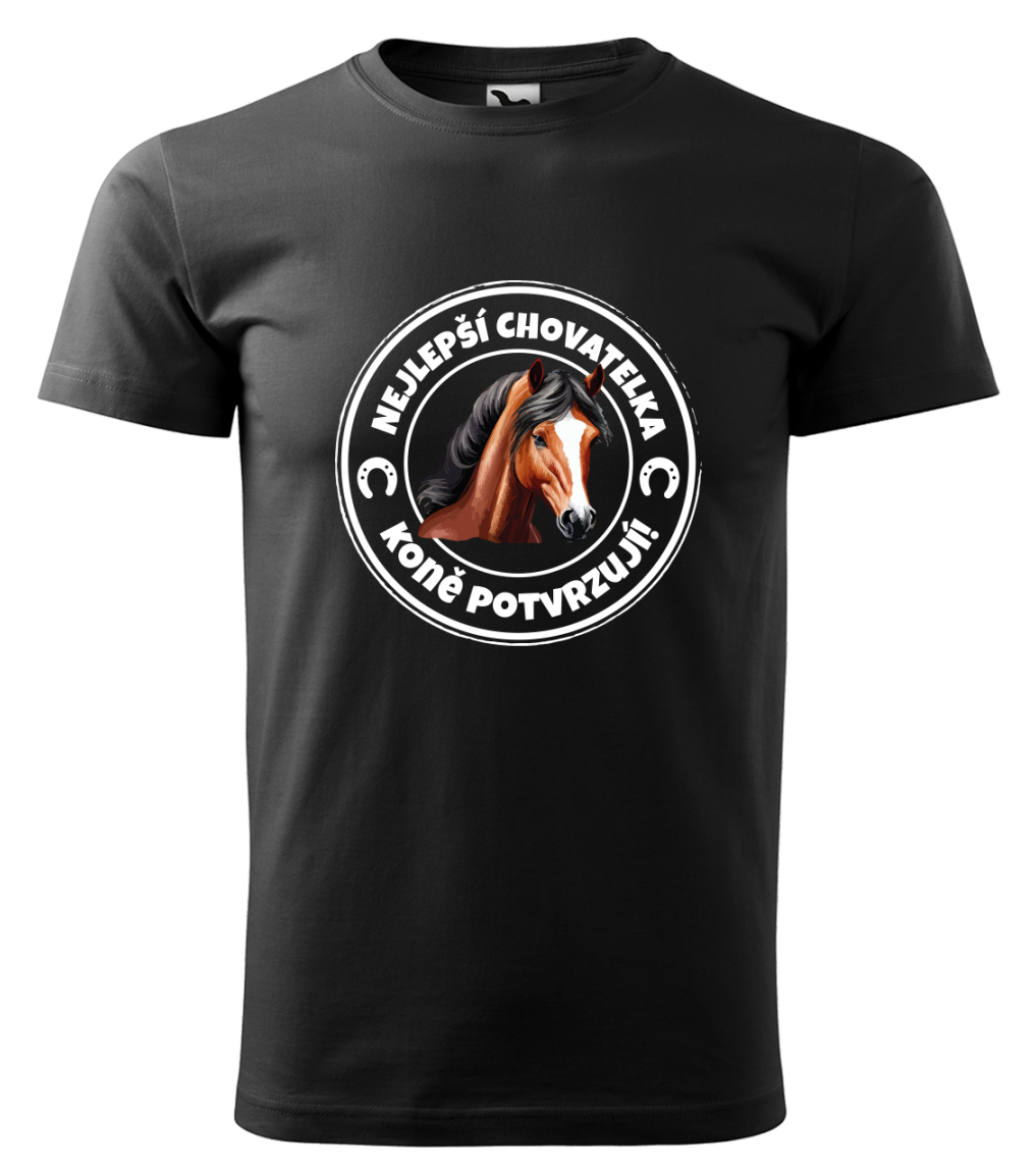 Hledáte dárek pro malou milovnici koní? Pro dívku, která se úžasně stará o koně? Máme pro vás dětské tričko s koněm a nápisem "Nejlepší chovatelka - koně potvrzují!". Nejlepší kousek oblečení, které potřebuje v šatníku každá malá koňařka. Tričko s koněm je vyrobené z kvalitní 100% bavlny vyšší gramáže a má moderní volnější střih - díky tomu je opravdu pohodlné při nošení. Tričko pro milovnici koní vám nabízíme k výběru z mnoha barevných variant triček - světlé i tmavé odstíny, pestré i přírodní tóny. Výběr je jen na vás. Také si u nás můžete vybrat z široké škály dětských velikostí. Vtipné tričko s koněm má kvalitní potisk, nepoužíváme levné nažehlovací samolepky, ale tvoříme opravdový potisk, který je přímo na textilu trička. Nahlédněte do spokojených recenzí a sami si ověřte kvalitu našich produktů a služeb.