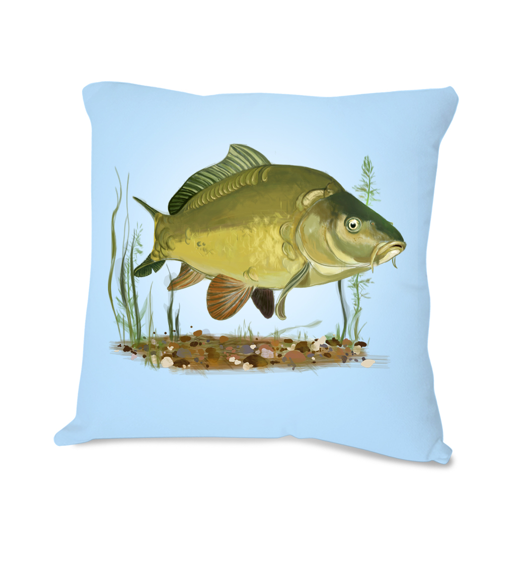 Čtvercový polštářek pro rybáře s kaprem. Polštář o velikosti 40 x 40 cm je vyroben ze 100% polyesteru. Kapr je vytištěn na přední straně. Zadní strana je bílá.