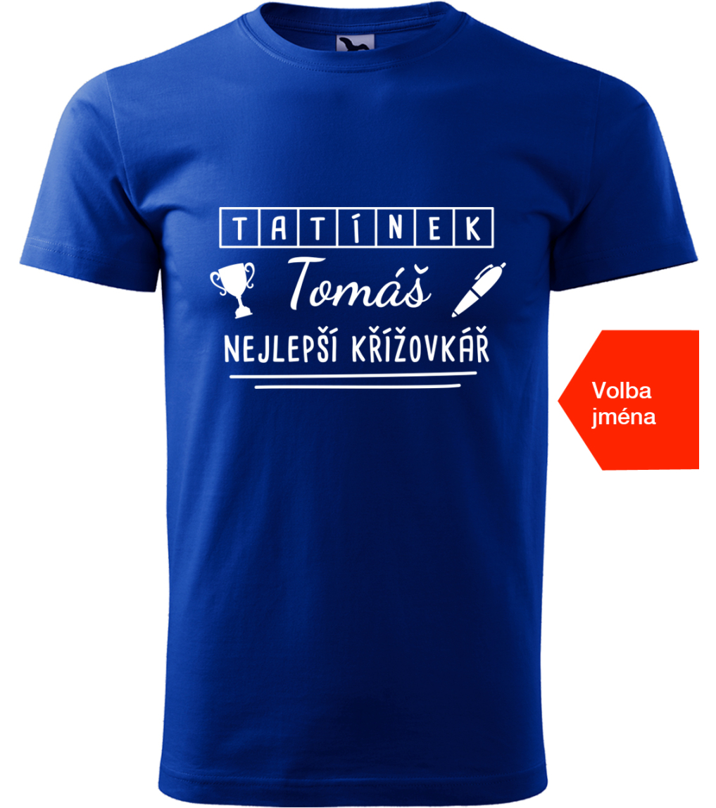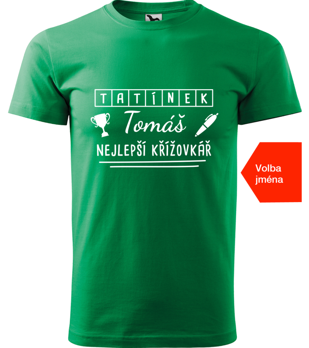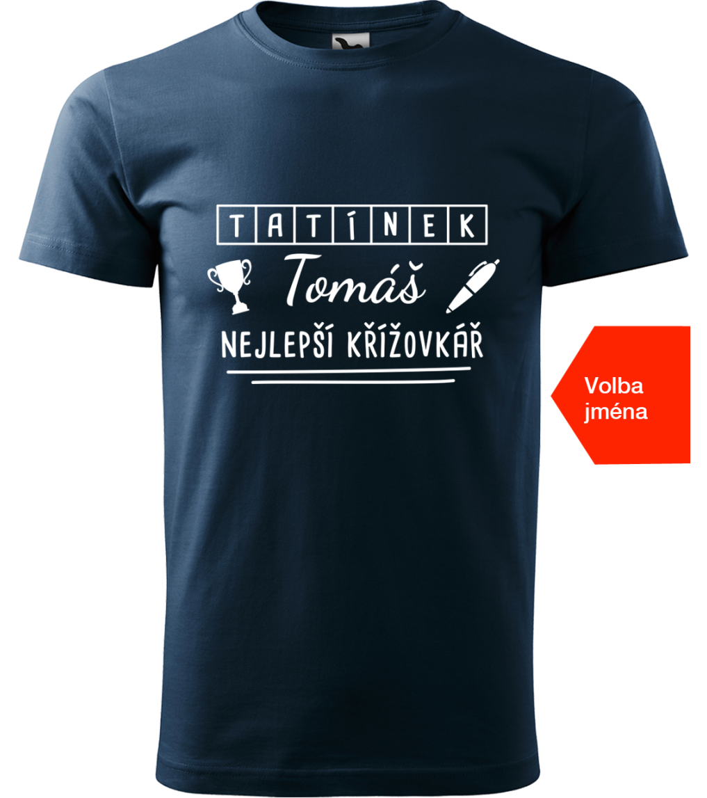 Pánské tričko s křížovkou s motivem "Tatínek (jméno vašeho táty) nejlepší křížovkář" je skvělý kousek oblečení do šatníku každého tatínka, který tráví volný čas tím nejlepším způsobem, který cvičí mozek i vědomosti, tedy luštěním křížovek. Tričko pro tátu má vyšší gramáž textilu a je vyrobené z kvalitní 100% bavlny. Nabízíme vám k výběru z několika barevných variant triček. Také ve velikostech se nemusíte držet zpátky, pánská trička si u nás totiž můžete vybírat z velikostí od S až po 4XL. Tričko pro křížovkáře má kvalitní a odolný potisk, který tvoříme pomocí nejmodernější technologie, která zaručuje kvalitu a super vzhled. Tričko se jménem je krásný dárek pro tátu, dárek, který je osobitý a opravdu udělá radost. Jméno tatínka napište do poznámky k objednávce a my jej vytiskneme na tričko.