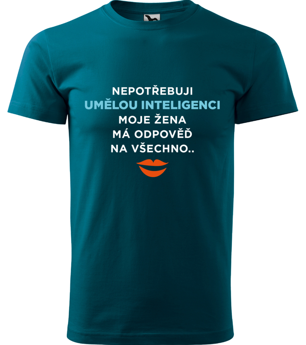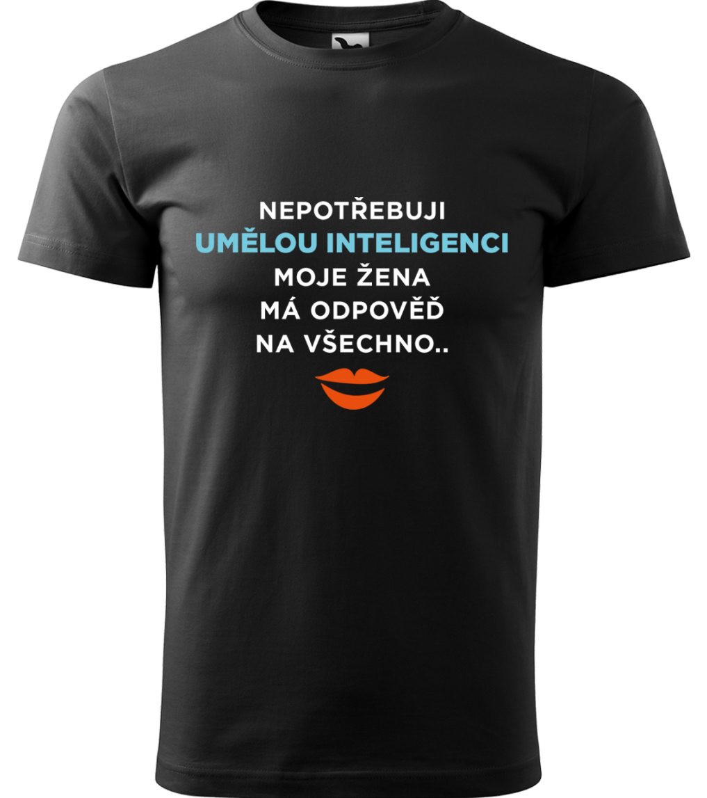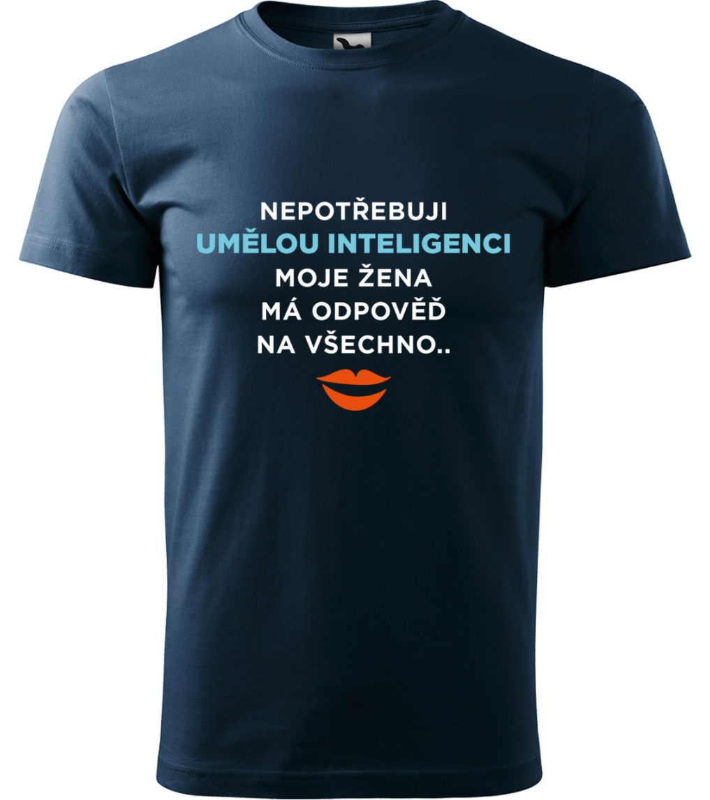 Vtipné tričko pro muže s motivem "Nepotřebuji umělou inteligenci - moje žena má odpověď na všechno" nutně potřebuje každý šťastně ženatý muž. Skvělý tip na dárek pro manžela nebo přítele. Vtipné tričko pro muže má vyšší gramáž textilu a moderní volnější střih, proto je opravdu pohodlné a skvěle padne každému typu pánské postavy. Tričko je vyrobené z kvalitní 100% bavlny a má špičkový potisk, který tvoříme pomocí nejmodernější tiskové technologie. Nabízíme vám výběr z mnoha barevných variant textilu a z velikostí od S až po 4XL. Pánové, máte doma studnici moudrosti, která překoná i umělou inteligenci, v podobě vaší úžasné a neskutečně chytré ženy? Pak je toto tričko přesně pro vás. Jistě ho ocení i vaše žena.