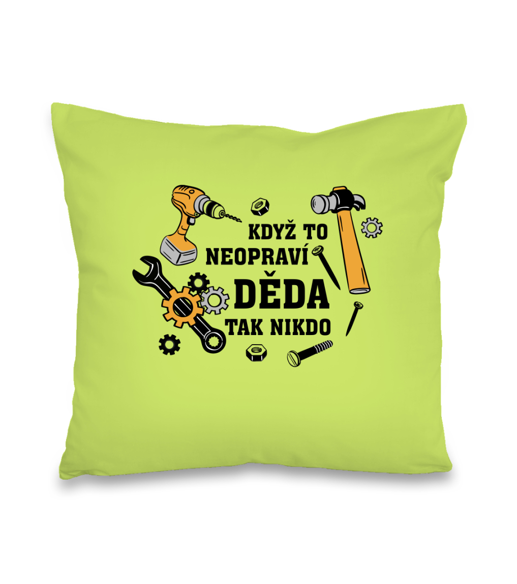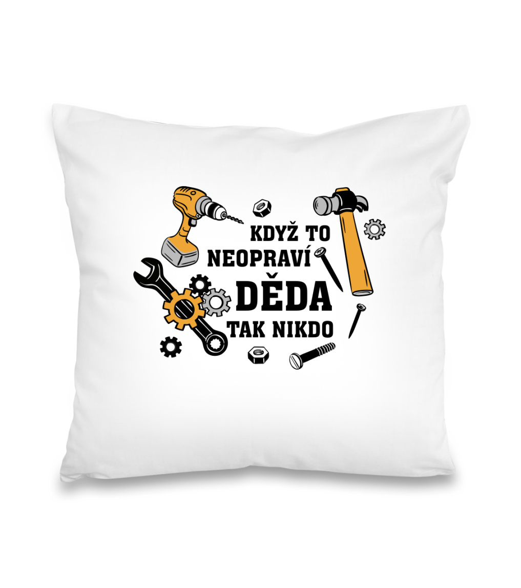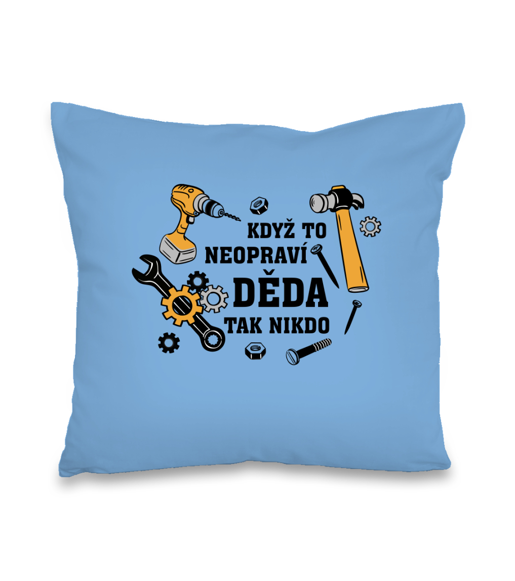 Polštář pro dědu, který opraví cokoliv. Polštář s nápisem „Když to neopraví děda tak nikdo“ je super dárek pro dědu, vášnivého kutila, automechanika, opraváře nebo instalatéra. Prostě pro dědu, který má šikovné ruce. Polštář má velikost 40 x 40 cm a jeho povlak je vyroben ze 100% bavlny se zapínáním na zip. Výplň polštáře je ze 100% polyesteru. Polštář nabízíme v široké škále pastelových barev.