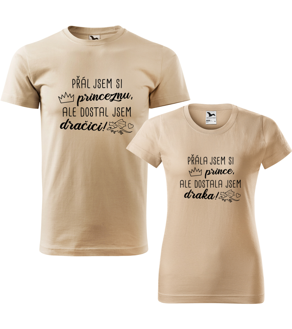 Trička pro páry jsou vyrobené z kvalitní 100% bavlny vyšší gramáže. Můžete si vybrat z mnoha barevných variant i velikostí. Naše trička pro páry mají příjemný střih a dobře se nosí. V našich originálních párových tričkách opravdu zazáříte. Pánové, přáli jste si princeznu, ale dostali jste dračici? Dámy, toužily jste po princi, ale nakonec vás dostal drak? Pak jsou tato párová trička přesně pro vás. Potisk na tričku je provedený pomocí nejmodernější tiskové technologie, která zaručuje super kvalitu a prvotřídní vzhled. Uvedená cena je za dva kusy triček. Pánská trička nabízíme od velikosti S až po 4XL a dámská trička o S do 2XL. Sami si tak můžete vybrat přesně vaše kombinace velikostí triček. Dračte v našich stylových tričkách, které to řeknou za vás a pobaví vás i ostatní.