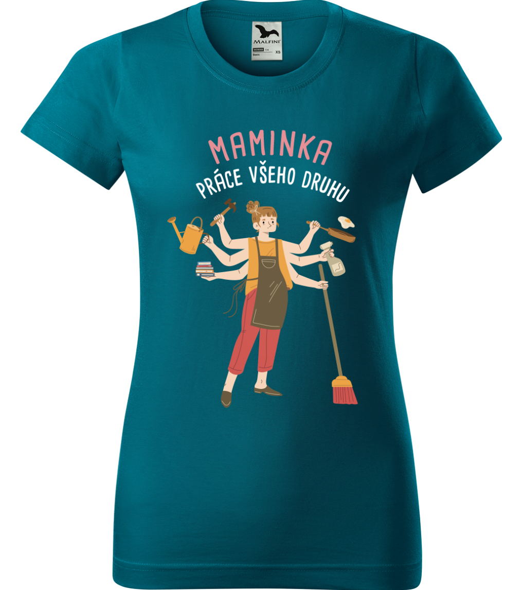 Vtipné tričko pro maminku s nápisem "Maminka, práce všeho druhu". Pro maminku, která stále něco uklízí, vaří, zametá, zalévá, a leští. Pokud hledáte tip na milá dárek pro maminku ke dni žen, k narozeninám nebo k Vánocům, toto vtipné tričko jí určitě pobaví. Tričko je vyrobené z kvalitní 100% bavlny a nabízíme ho ve velikostech od S až po 2XL (černé tričko až 3XL). Tričko má dámský, lehce vypasovaný střih. Potřebujete tričko do druhého dne? Není problém. Rychlé vyřízení objednávky je u nás samozřejmostí. Spokojené recenze našich zákazníků mluví za vše. Tak objednejte toto vtipné tričko pro maminku ještě dnes a vykouzlete jí úsměv na tváři.