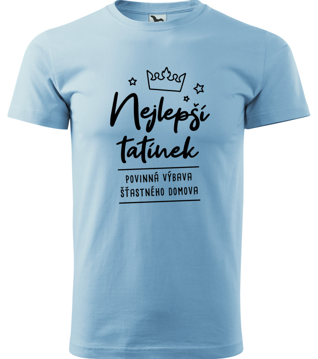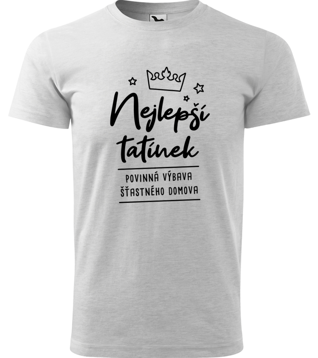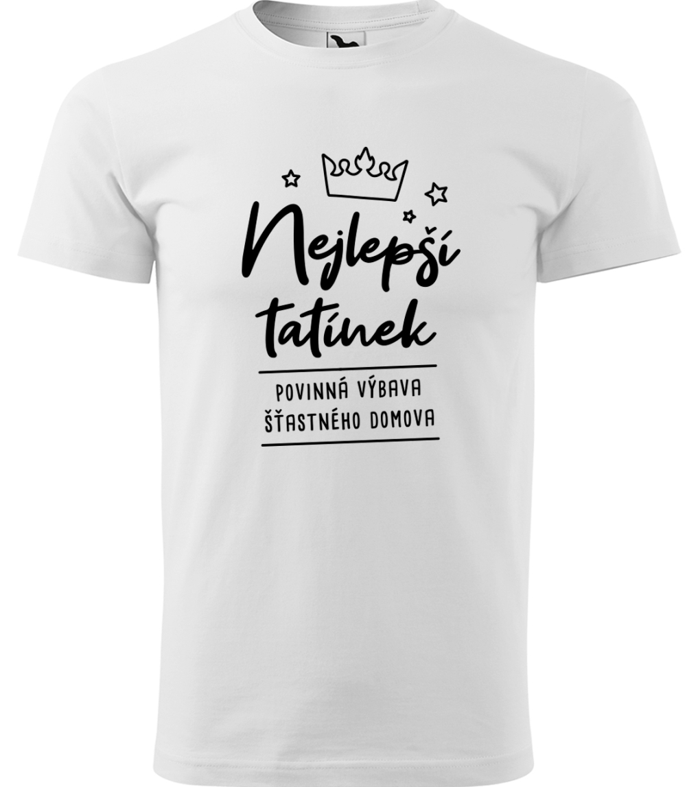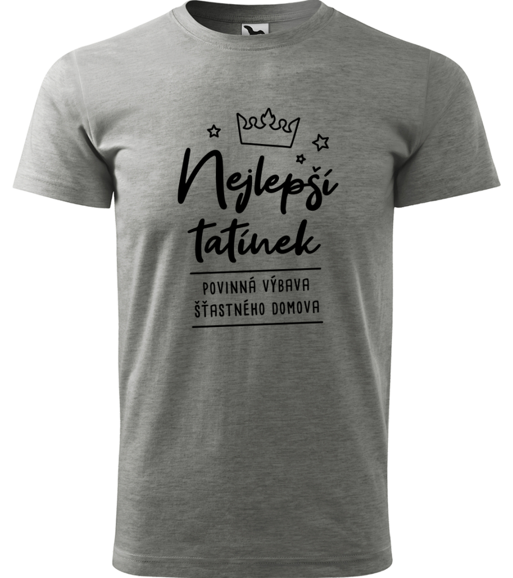 Tričko pro tátu s humorným potiskem "Nejlepší tatínek - povinná výbava šťastného domova" je určené všem úžasným tatínkům, které můžete tričkem obdarovat třeba k narozeninám nebo ke Dni otců.
