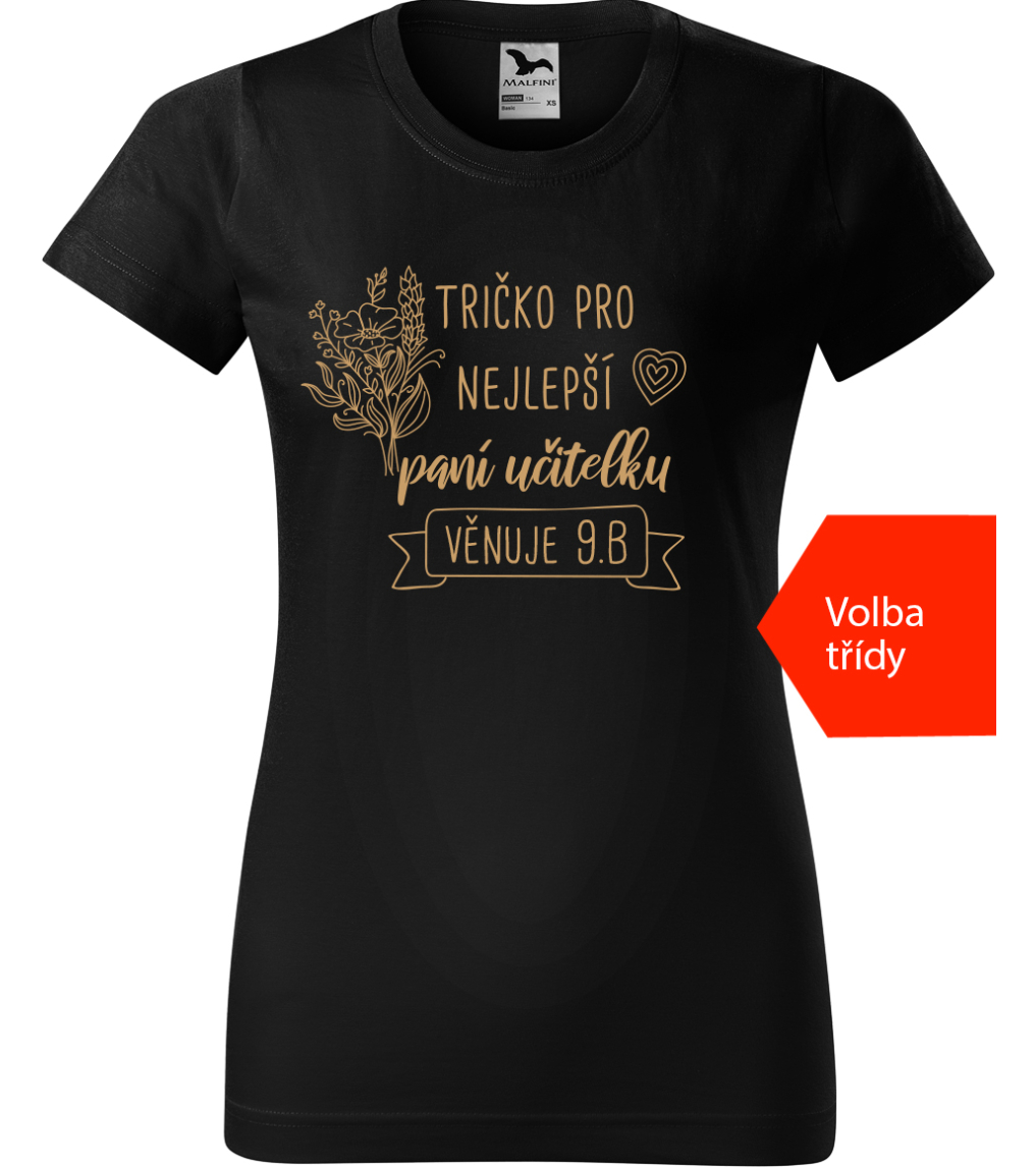 Kvalitní 100% bavlněné tričko pro učitelku s květinami, věnováním a označením třídy nebo se jménem žáka. Hledáte dárek pro učitelku na rozloučenou při odchodu ze školy nebo školky? Pořiďte jí tričko s osobitým motivem, který jí bude připomínat, jak moc je výjimečná a jak si jí její třída váží. Tričko pro učitelku nabízíme v několika barevných variantách - sami si vyberete barvu a vytvoříte kousek oblečení přesně dle vašich osobních preferencí. Dárek pro učitelku, který je milý, osobitý a zároveň má praktickou funkci. Všechna naše trička mají prvotřídní kvalitu potisku - nepoužíváme levné nažehlovací samolepky, ale opravdový potisk, který je přímo na textilu. Na tričko vytiskneme označení třídy, které nám napíšete do poznámky.