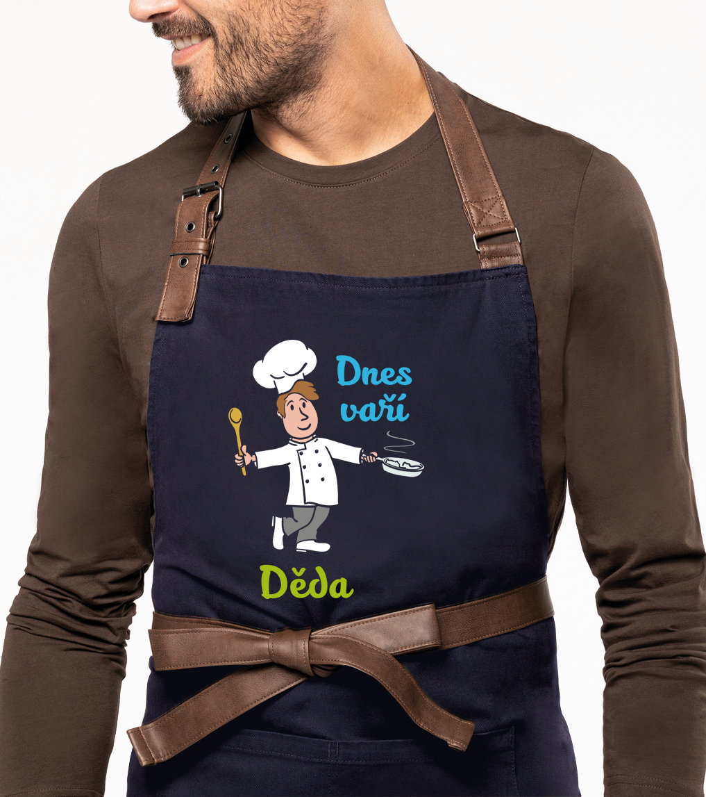 Hledáte zástěru pro muže s originálním potiskem? Zástěra na vaření s nápisem „Dnes vaří děda“ je skvělý dárek pro všechny dědy, kteří rádi a dobře vaří. Zástěra na vaření v módním vintage stylu je vyrobena ze 100% bavlny. Rozměr zástěry jsou 90 x 76 cm je dost velký i pro rozměrnější kuchaře. Délka zástěry je pod kolena. Kolem krku řemínek s nastavitelnou kovovou přezkou + pásek k uvazování v pase. Řemínky a pásky na uvazování pokryty imitací kůže.
