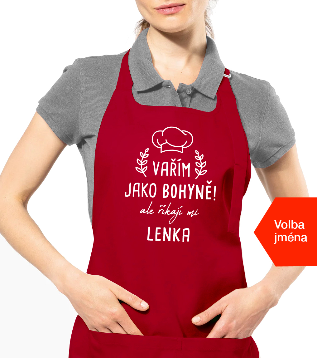 Zástěra pro ženy s potiskem "Vařím, jako bohyně, ale říkají mi..(vaše jméno)" je to nejlepší, co si na sebe při vaření můžete obléct. V našich zástěrách se skvěle vaří! Pokud vaříte jako bohyně, pořiďte si naší zástěru na vaření s vaším vlastním jménem. Dámská zástěra na vaření je vyrobená ze 100% bavlny vyšší gramáže 280 g/m². Zástěra je opatřená laclem a řemínkem s kovovou sponou pro nastavení délky. Na zástěru vytiskneme vaše jméno, které napíšete do poznámky. Všechny naše produkty mají špičkovou kvalitu. Na textil používáme nemodernější tiskovou technologii, která zaručuje vysokou kvalitu potisků a krásný profesionální vzhled.